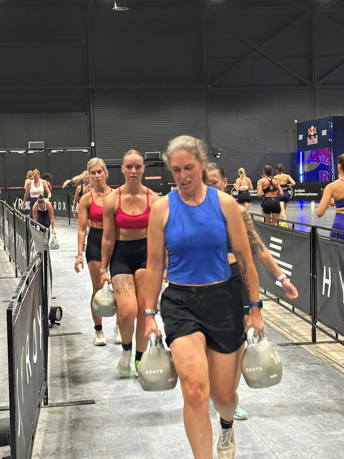 – Willy Drummen-Sikma (blauwe shirtje), hyroxliefhebber bij Putti’s Workout. Willy (zij is arts) liep als student samen met Daniëlle (van Flow) haar eerste marathon in Rotterdam.